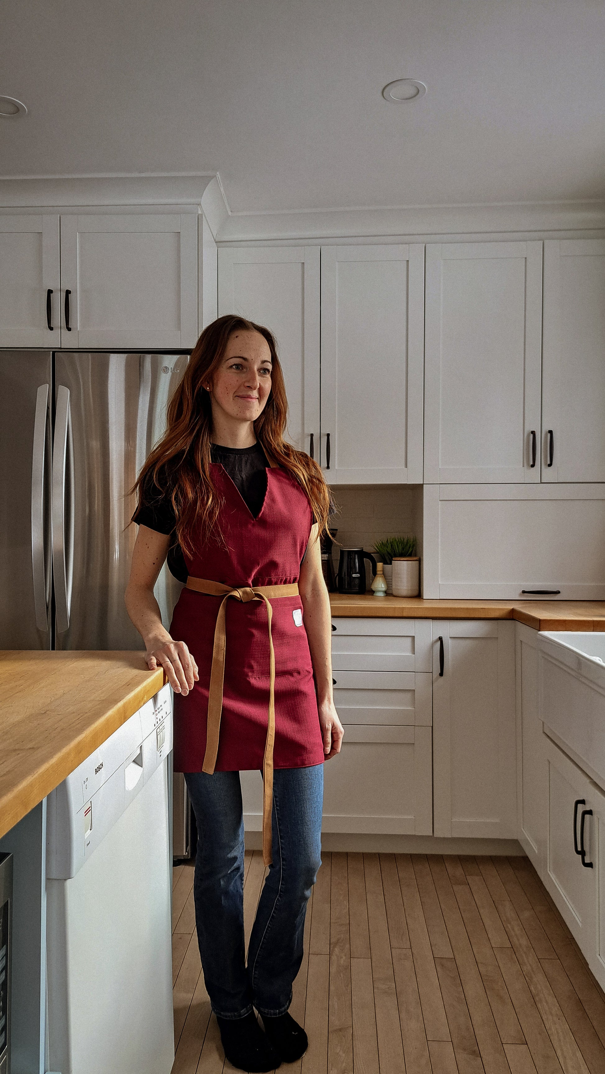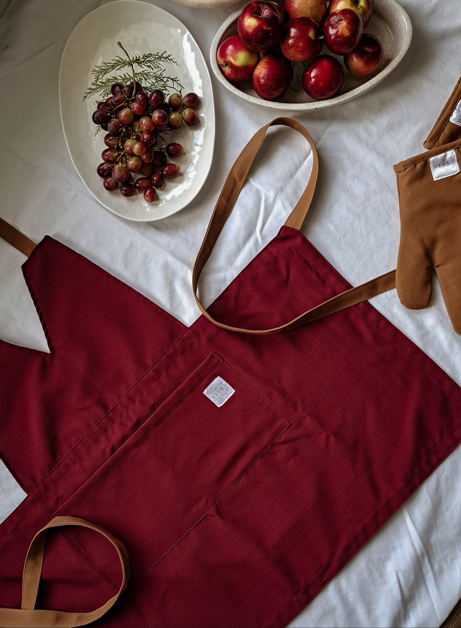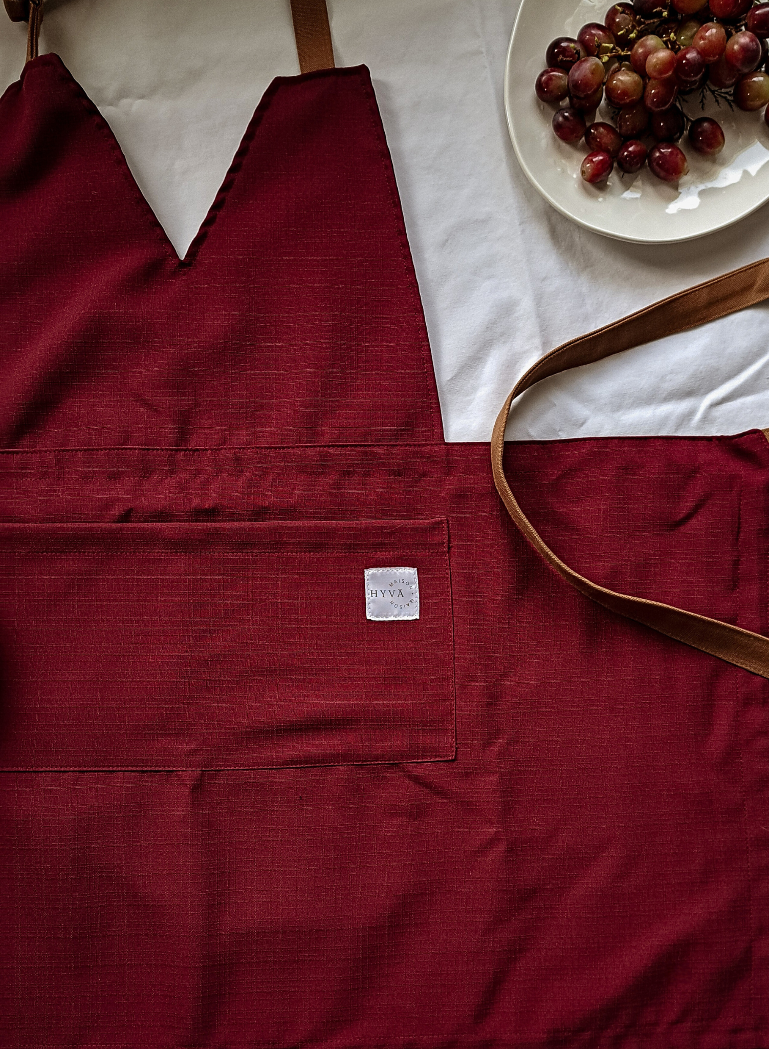 Notre nouveau tablier aux tons rouge vin avec des détails de caramel chaud vous donnera certainement le goût de cuisiner !